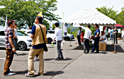 これまでもホームページなどでお伝えしてきましたように、ソニックデザイン リスニングキャンプは「細かなスケジュールを設けない」「誰でも申し込みなしで好きな時間に立ち寄れる」「参加者のお名前や連絡先を敢えて伺わない」「コンテストなどの勝負をしない」といった"ユルい"イベントを目指しています。これは弊社が初めて主催するお客様向けイベントとして、カーオーディオの楽しさをもっとも純粋に、また身近に味わっていただくにはどうしたら良いかをいろいろ考えた結果なのですが、果たしてこの"ユルい"コンセプトをお客様に受け入れてもらえるかどうか、混乱や事故など不測の事態が発生しないか、スタッフ一同、正直不安もありました。しかも当日の天気予報は雨。会場に設営するテントの数を倍に増やしたり、交通整理のアルバイトも増員したりと、"ユルい"中にも出来る限りの手を尽くして本番に臨みました。