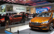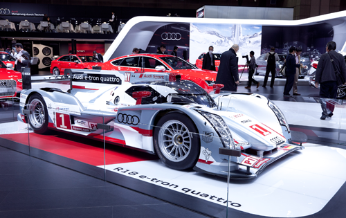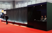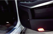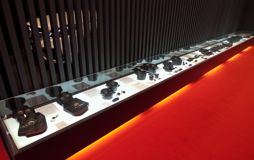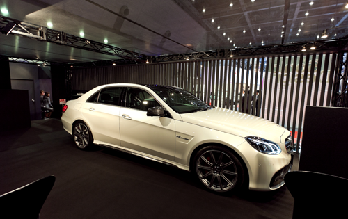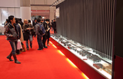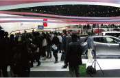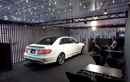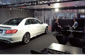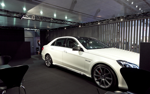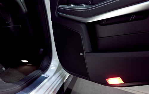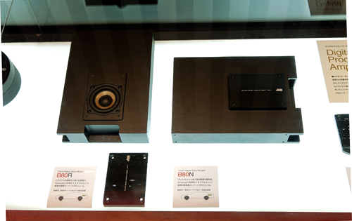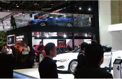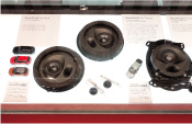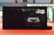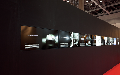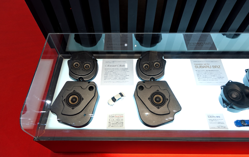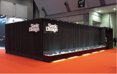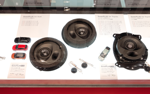 今回のソニックデザインブースでは、77mmスーパーバスモジュールの「B80N」「B80R」、そしてSonicPLUSのアウディ車専用スピーカーパッケージ6機種(A4専用の「SP-A48M」「SP-A48E」、A3専用の「SP-A33M」「SP-A33E」、A1専用の「SP-A11M」「SP-A11E」)の計8機種がワールドプレミア(世界初公開)されました。また、10月の発売以来「3時間で取り付けられるハイエンドスピーカー」として注目を浴びるSonicPLUS THE CRESTのプリウス専用モデル「3C-P30」も実物を展示。全長9mのショーケースいっぱいに新製品や人気製品が並べられています。いっぽうブース内部には、メルセデスとソニックデザインとのコラボレーションが生んだ純正オプショナルサウンドシステムの最高峰「E-Class Sound Suite」(新型)を搭載したE63AMG Sを展示。今回は展示のみで試聴デモは行っておりませんが、ご希望のお客様には後日試聴していただけるようメルセデス・ベンツ販売店をご紹介いたしますので、スタッフにお申し付けください。