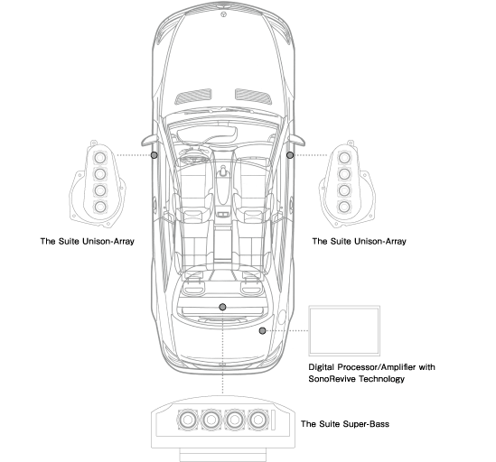 论是音质音域的调整还是电力增幅,都可以进行严格控制的数码放大器●将原装音响的声音高品质重现的SonoRevive技术●由两组共四个口径只有52毫米的宽波段驱动器SD-N52N组成的无缝高精度铝压铸全频驱动器「The Suite Unison-Array」●装有专用端口调节器、由一组共两个顶级微型扬声器单元「SD-N77N」组成的双重高精度铝压铸可添加式扬声系统「The Suite Extend-Woofer」●根据乘客的有无而进行的音域和音质的调节、和根据车门的开关和与倒车档联动的而对音响开关进行操作的全自动化控制