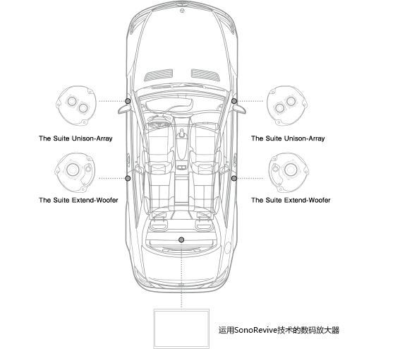 无论是音质音域的调整还是电力增幅,都可以进行严格控制的数字放大器●将原装音响的声音高品质重现的SonoRevive技术●由两组共四个口径只有52毫米的宽频驱动器SD-N52N组成的无缝高精度铝压铸全频驱动器「The Suite Unison-Array」●装有专用端口调节器、由一组共两个顶级微型扬声器单元「SD-N77N」组成的双重高精度铝压铸可添加式扬声系统「The Suite Extend-Woofer」●根据乘客的有无而进行的音域和音质的调节、和根据车门的开关和与倒车档联动的而对音响开关进行操作的全自动化控制