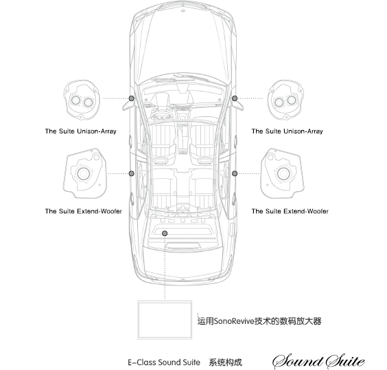 无论是音质音域的调整还是电力增幅,都可以进行严格控制的数字放大器●将原装音响的声音高品质重现的SonoRevive技术●由两组共四个口径只有52毫米的宽频驱动器SD-N52N组成的无缝高精度铝压铸全频驱动器「The Suite Unison-Array」●装有专用端口调节器、由一组共两个顶级微型扬声器组合「SD-N77N」组成的双重高精度铝压铸可添加式扬声系统「The Suite Extend-Woofer」●根据乘客的有无而进行的音域和音质的调节、和根据车门的开关和与倒车档联动的而对音响开关进行操作的全自动化控制