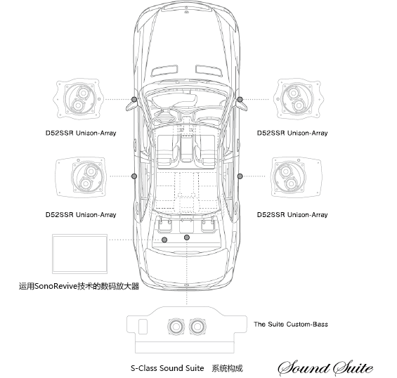 无论是音质音域的调整还是电力增幅,都可以进行严格控制的数字放大器●将原装音响的声音高品质重现的SonoRevive技术●专为S系列开发,以口径52毫米全频驱动单元「D52R」(premium line R系列)为基础的扬声系统「D52SSR Unison-Array」2组(4台)●外容器为高刚性铝压铸一体式,内藏两组高级微型低音单元=SD-N77R的重低音系统「The Suite Custom-Bass」●根据乘客的有无而进行的音域和音质的调节、和根据车门的开关和与倒车档联动的而对音响开关进行操作的全自动化控制