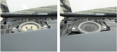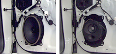 左:安装在前门的原装中低音扬声器示例 右:SonicPLUS丰田车专用中低音扬声器安装示例(照片为T300系列)