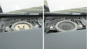 30系プリウスの純正ダッシュボードスピーカー(写真左)と、3C-P30L Triple Crestの52mm ARMSモジュール取り付け後(写真右)の比較。ボルトオン&カプラーオンで取り付けられ、車両への加工は一切不要です。
