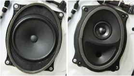 左:背面开放的普通原车喇叭(概念说明图) 右:采用全封闭方式的丰田车专用机型的前声场中低音扬声器(图片为T300系列用)