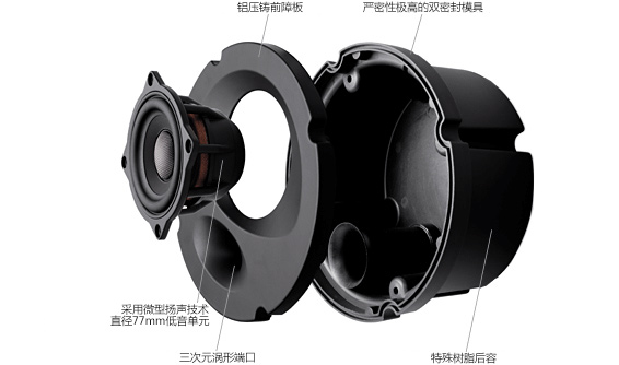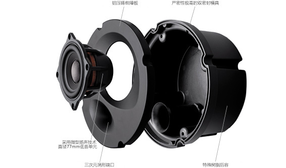 超出级别还原准确丰富的信息量。DMF振膜和窄间隙电磁系统所组成的77mm中低音扬声器单元