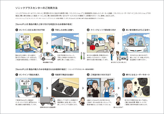 SonicPLUSをご自身で取り付けたり、お知り合いのショップなどに取り付けを依頼されるお客様のために、「ソニックプラスセンター新潟」のオンラインショップではSonicPLUS製品のみをご購入いただくこともできます。オンラインショップで販売されたSonicPLUS製品には、製品の取り付けや使い方に関する基本的なご質問にお答えする販売後90日間のユーザーサポート(電話またはメール)を無償でお付けいたします。